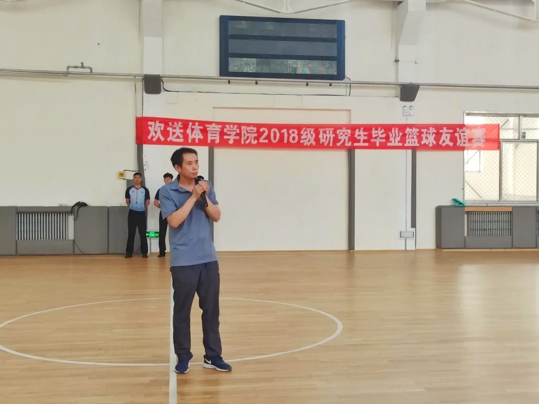 党委副书记贾鹏老师为篮球友谊赛致开幕词并宣布比赛开始,同时他还表示:“希望同学们能赛出水平,赛出风采,尽情享受在学校的最后时光,并且在今后的生活和工作当中要继续保持体育人自强不息,勇于拼搏的精神。