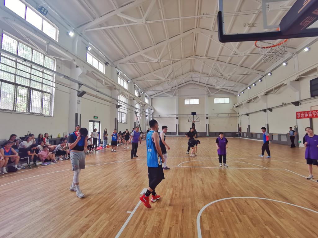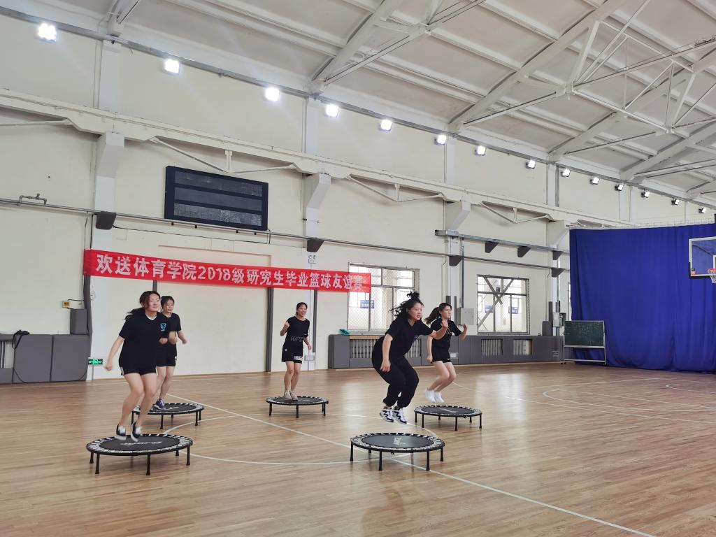 比赛正式开始,现场的气氛迅速升温,在此起彼伏的助威声中,队员们迅速投入到比赛中。赛场上的球员个个雄姿英发,情绪高涨,现场气氛十分活跃。中场休息时,研一研二的同学还呈现了一场活力四射的蹦床表演。