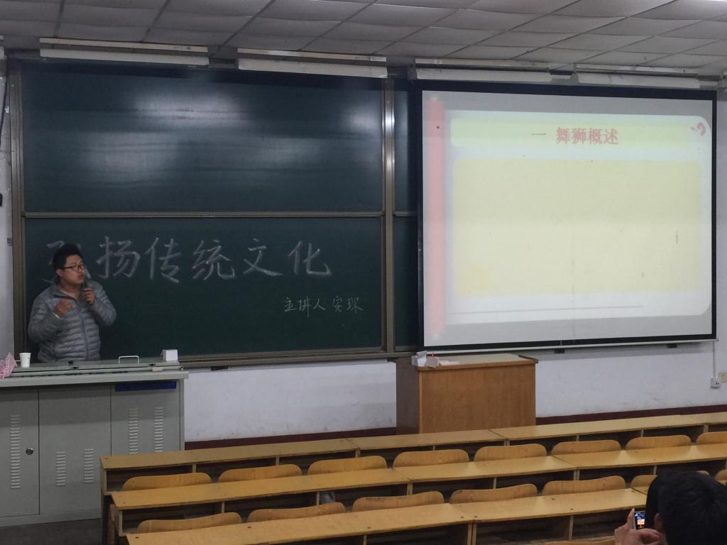 团委书记唐伟老师主持。同时邀请了博彩平台研二学长安琛同学为我们讲述我国传统体育文化——舞龙舞狮的项目。