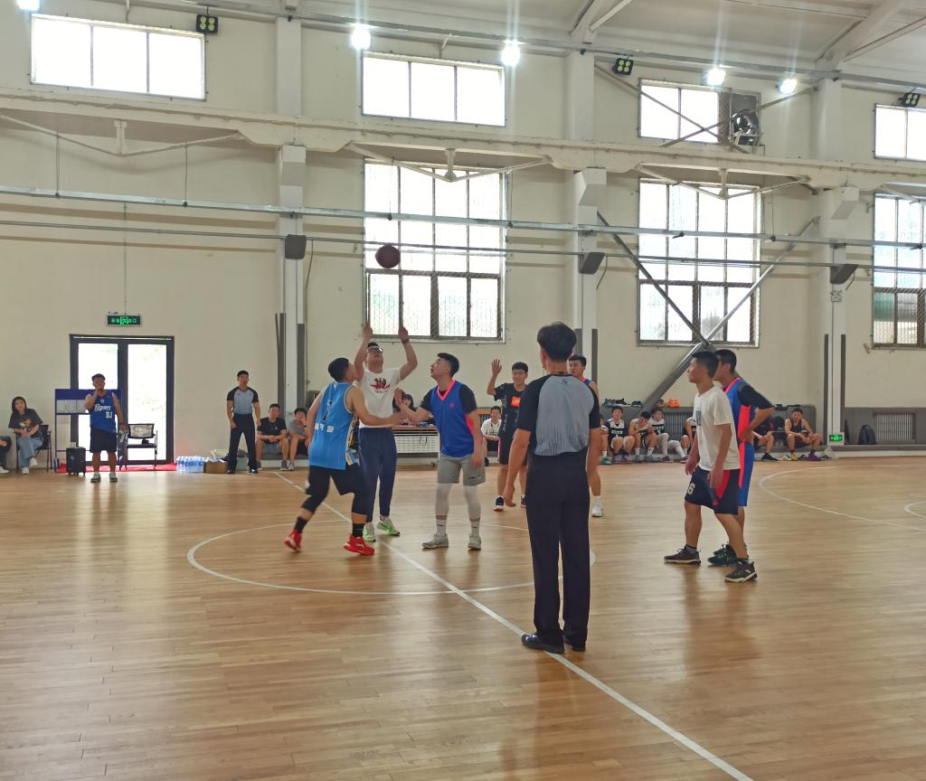 比赛正式开始,现场的气氛迅速升温,在此起彼伏的助威声中,队员们迅速投入到比赛中。赛场上的球员个个雄姿英发,情绪高涨,现场气氛十分活跃。中场休息时,研一研二的同学还呈现了一场活力四射的蹦床表演。