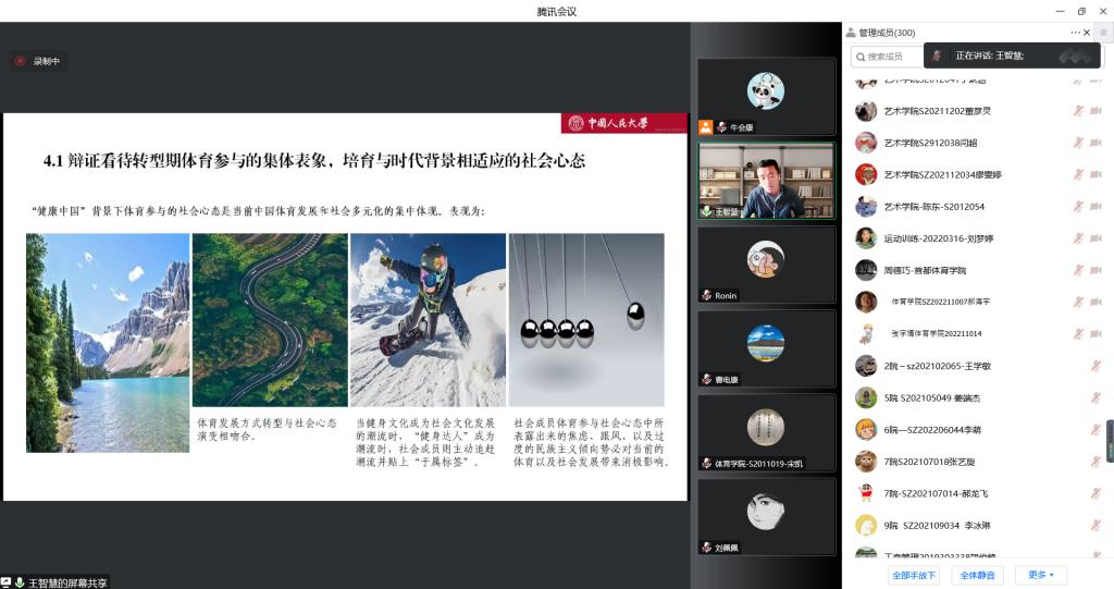 在交流讨论环节中,与会师生针对“跟风”的体育参与行为是否能用“拟剧论”、“拟态环境”来解释;体育自媒体以及受众能否划分圈层等问题,与王智慧教授进行了深入的探讨,使得同学们对于大众体育参与对社会心态的适应有了更深刻的理解。最后,感谢王教授的精彩分享,本次的华彩讲坛精彩纷呈,充满思想冲击力,同学们受益匪浅,本次讲座在各位同学的掌声中圆满结束。