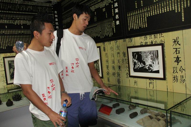 2012年7月7日,是我国“七七事变”纪念日。在杜鹃、张鹏老师的带领下我们参观了被称为爱国主义教育基地的辽县(左权县)抗战纪实纪念馆,在里面陈列了抗战时期传讯文件原件以及当地农民自制的土枪土炮。让我们了解了左权县在抗战时期的艰苦历程,以及当地农民抗日的精神。