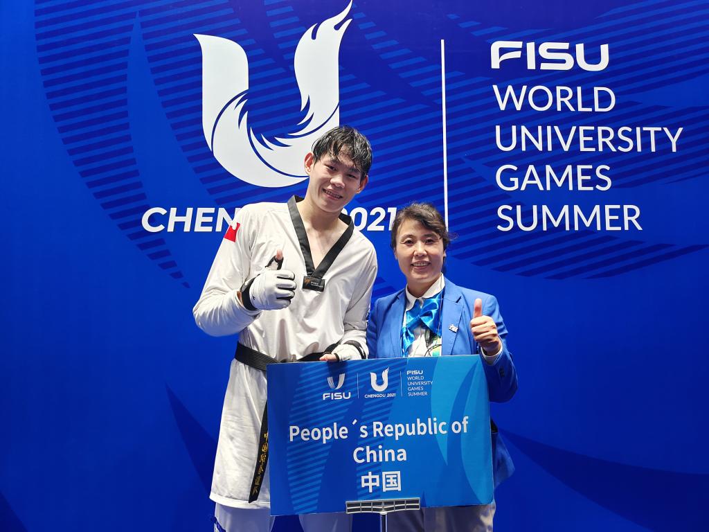 8月3日,在刚刚结束的成都世界大学生运动会跆拳道男子87公斤级以下的比赛中,我校学生孟明宽以2:1逆转险胜伊朗选手成功夺冠,为中国代表团拿下宝贵的一枚金牌。