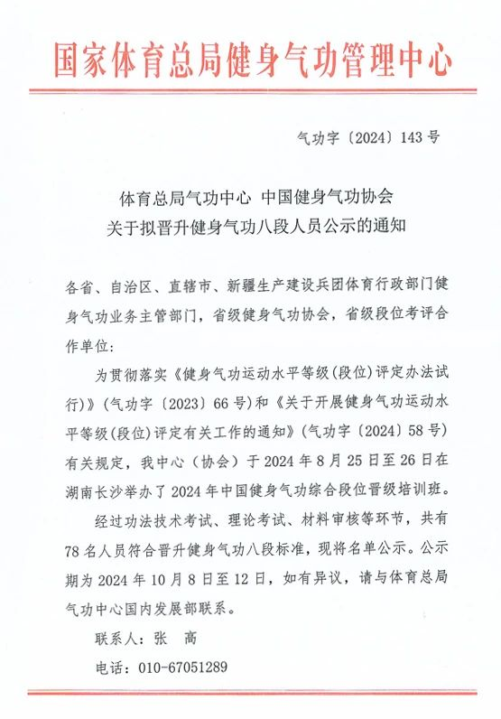近日,为贯彻落实国家体育总局健身气功管理中心、中国健身气功协会下发的《健身气功运动水平等级(段位)评定办法(试行)》(气功字〔2023〕66号)和《关于开展健身气功运动水平等级段位评定有关工作的通知》(气功字〔2024〕58号)有关规定,经过严格的功法技术考试、理论考试及材料审核等环节,全国共有78名人员脱颖而出,符合晋升健身气功八段的标准。其中,博彩平台康任侠老师凭借其卓越的技术水平和深厚的理论功底,成功晋升中国健身气功八段,再次彰显了在健身气功领域的深厚修为与卓越贡献。