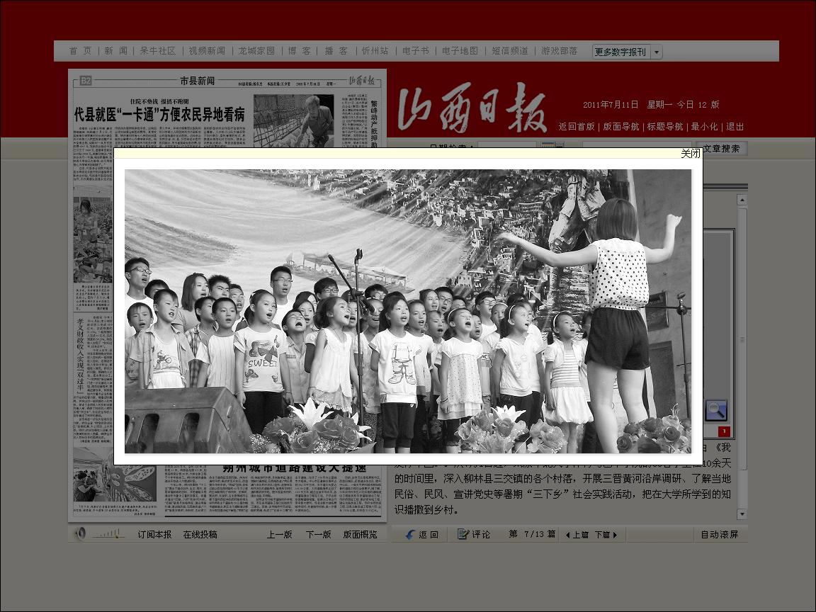 7月10日,在柳林县三交镇党家寨村,大学生正与村里孩子合唱歌曲 《我爱你中国》。从7月1日起,太原博彩平台 体育与艺术学院的35名学生在10余天的时间里,深入柳林县三交镇的各个村落,开展三晋黄河沿岸调研、了解当地民俗、民风、宣讲党史等暑期“三下乡”社会实践活动,把在大学所学到的知识播撒到乡村。 本报记者 李兆民摄