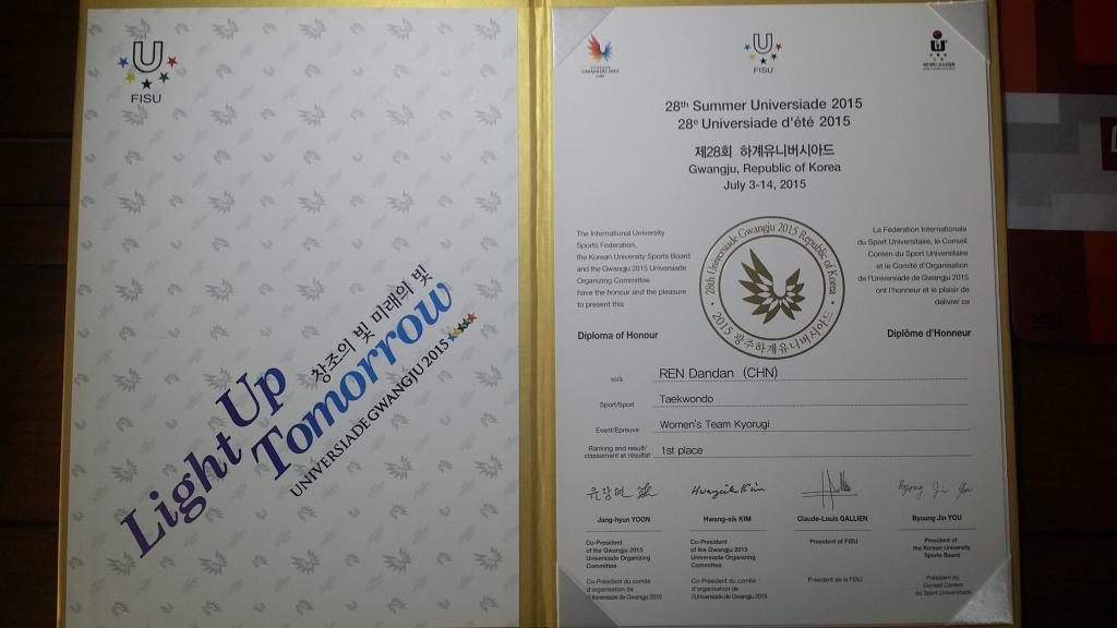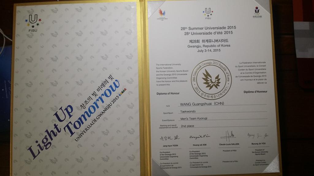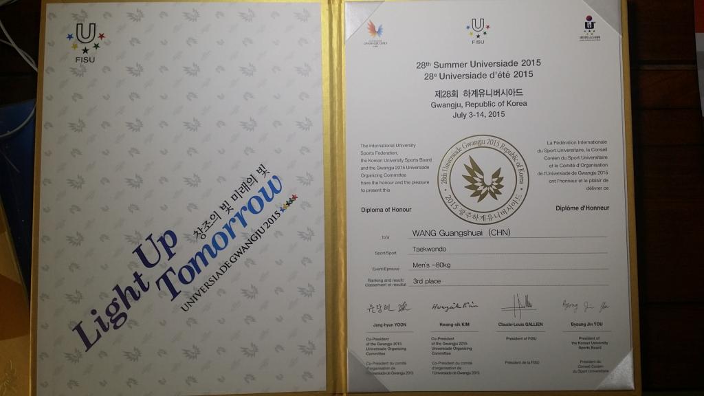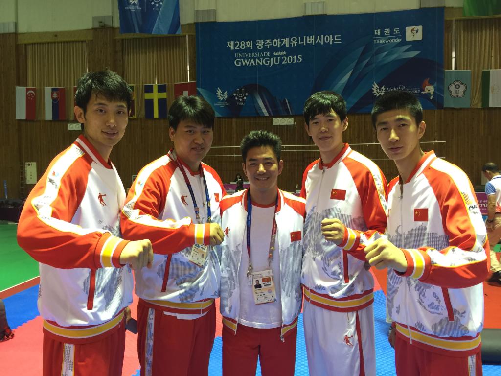教师窦永涛,学生王广帅、任丹丹代表中国第一次参加世界大学生运动会跆拳道项目,先后夺得女子团体赛冠军、男子团体赛亚军、男子80公斤级季军(王广帅),使五星红旗三次在韩国光州冉冉升起,为国争得了荣光。本次比赛的规模和水平都创造了世界大学生运动会跆拳道比赛的历史。由于明年是奥运会,各国选手为争夺奥运积分,纷纷派出了最强选手,均为世界排名靠前的选手,比赛异常激烈。