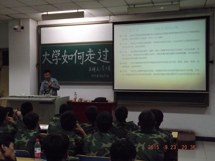 之后,李士荣老师给同学们讲解了学生手册,讲述了大学的规章制度,奖励与处分,抽烟,夜不归宿,旷课,偷盗,在校期间的安全等一系列问题,李士荣老师强调作为一个学生成绩是基础,上了大学是一个新的起点,大学四年的学习和积累会使你的羽翼更丰满,使你非常优秀。