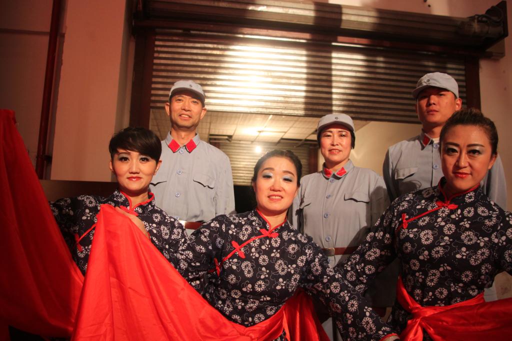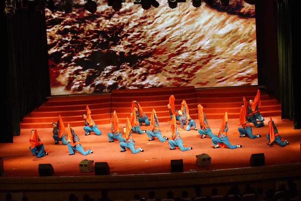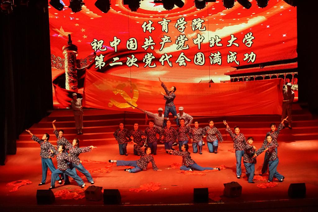 节目分三个部分,节奏欢快的红绸舞、单人刀舞、柔美慢舞等,22名演员,以黄河大合唱为主题曲,穿插东方红音乐,配以紧扣主题的黄河浪涛及毛泽东光辉形象等巨幕背景,气势磅礴,舞蹈形象生动地展现抗日战争那个不屈、悲壮、奋斗不息的年代。由于体育教师的基本功扎实、训练有素,加之为迎接当党代会这样意义重大的活动,老师们格外尽心尽力,加班加点刻苦排练,功夫不负有心人,整场演出5份30秒,精彩纷呈,赢得了全场喝彩。