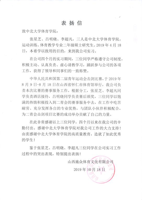 17级研究生的实习工作进行总结,对学生的专业素养、日常工作态度以及人际交往能力给予较高评价,并送来了表扬信。她指出,二青会的成功举办将会使山西体育的发展迎来前所未有的机遇,对体育类人才的需求也会逐步扩大,作为发展中的体育文化产业公司也急需学院优秀人才的输出和补给。双方对今后的研究生实习平台的建设、实习工作的开展达成一致意见。