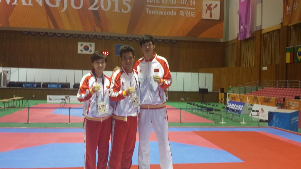 教师窦永涛,学生王广帅、任丹丹代表中国第一次参加世界大学生运动会跆拳道项目,先后夺得女子团体赛冠军、男子团体赛亚军、男子80公斤级季军(王广帅),使五星红旗三次在韩国光州冉冉升起,为国争得了荣光。本次比赛的规模和水平都创造了世界大学生运动会跆拳道比赛的历史。由于明年是奥运会,各国选手为争夺奥运积分,纷纷派出了最强选手,均为世界排名靠前的选手,比赛异常激烈。